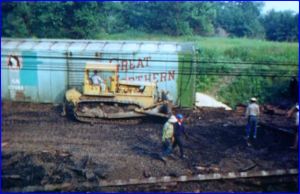 A fascinating segment of a big 1971 freight train derailment. Classic 40′ boxcars in distress. See the progress of the large workcrew. Roger wouldn’t get that close to the area nowadays!