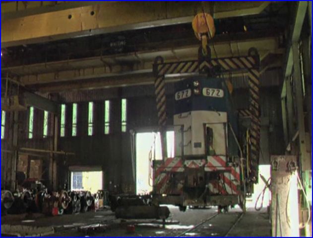 At new Smyrna Beach, the heavy maintenance facilities include an upward view of the locomotives undercarriage, as viewed from a service pit. A shop tour visit there. Best moment is a GP9 lifted on the overhead crane system and transferred to another track. It’s much easier to accomplish this feat in HO scale!