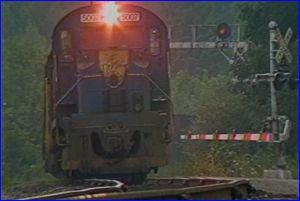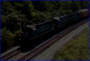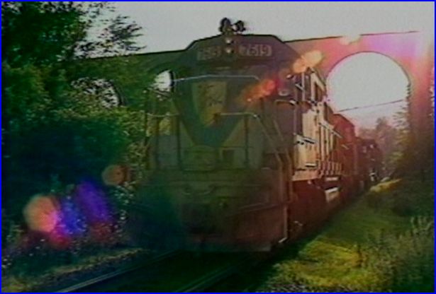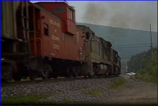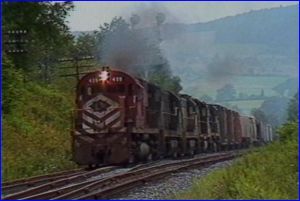 Memorable action, as we chase a trio of Alco Century C-424m locomotives with symbol train MB5 on the old Erie trackage. We chase it across the countryside, town to town, at speed. Good chase segment. Nice scene, as the train crosses a bucolic valley…