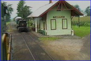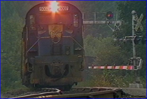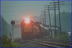The Mills Job is a local we board. Alco Century C424m #452, and a great sounding Nathan 5 chime horn! It’s cab ride time! We switch at Owego and Conrail EMD’s roll with a freight. You’ll notice some discoloration on your screen, that was caused by the bright headlight of the Century, in the rain. It temporarily burned the pickup tube in the camcorder. Your TV is safe, it will clear.