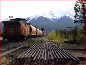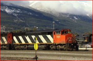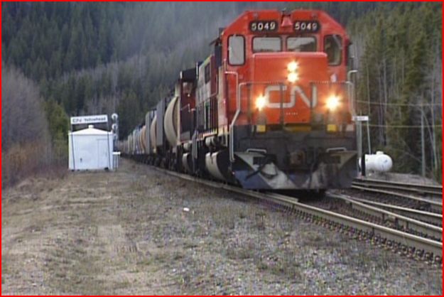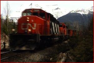 Mt. Robson, at over 12,000 feet is the highest point in the Canadian Rockies. It makes a dramatic backdrop for trains passing the area. The Mt. Robson subdivision has dense forest with high pine trees. There are many runbys here. The trains bound for Prince George all have a required CN caboose.