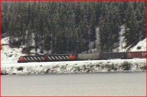Yellowhead Pass is loaded with train action! Types of freight include; milled lumber on bulkhead flatcars, tanks, and CN boxcars. The usual assortment will also be found in the form of interchange cars. Sharp eyed viewers will see a cut of a CN crane and related equipment on a freight. Grain trains are plentiful. Intermodal and some coal moves, as well. The film frequently has the entire consist rollby.