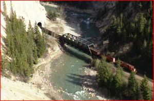 Yoho is a transitional scene as the train travels ever upwards, towards the upper spiral. This tunnel is within Cathedral Mountain. The mountain is unbelievable. You will find the origin of the name, Kicking Horse, within the program.