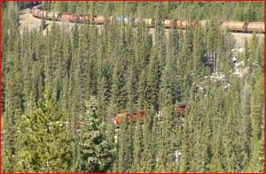 Our railfanning continues at the lower spiral of Kicking Horse Pass.This is deep within the heavy pine forest. The train is there, just don’t expect Tehachapi Loop type viewing.