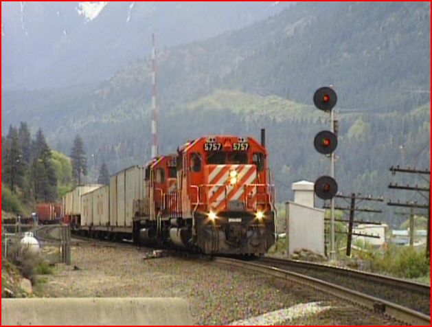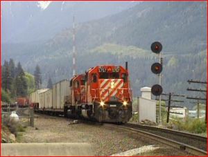 The normal locomotives are SD40-2 types. Various options include, wide safety cabs, and full length cowls. CP Rail has mid train SD40 helpers with locotrol equipment for control. Seems that at least one unit in each set of locotrol helpers has blanked out windows. Probably these house the specialized gear required. Keep a sharp eye out for at least one full height pacman logo on a locotrol helper. Canadian National also has some safety cab GP40 diesels on a few trains.