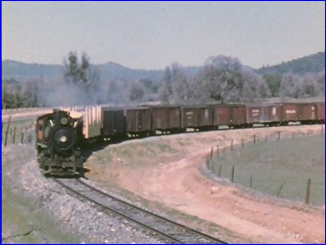Sierra Railroad #34 pulls a train out of town and more. Many good sequences of the train moving through the countryside. This film material acts as a time machine. The viewer gets to see period vehicles and people interact in the scenes. Six Sierra Railroad steam engines are viewed while they were in service. Mainly a show of freight trains. The fantrips are the passenger service.