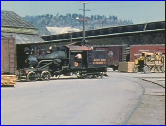 The Angels Camp is up next. A pair of oldtimers who worked the line reminisce. West Side Lumber gets a visit in Toulumne. Diminutive Heisler #3 is operating as a switcher. It is dwarfed by the freight cars.