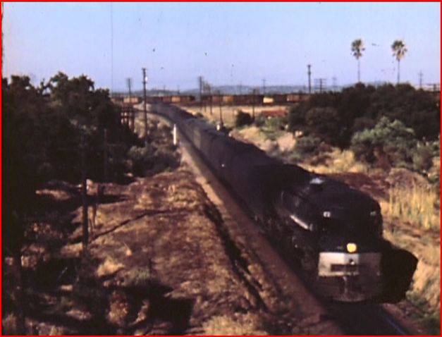 We start with a look at the San Francisco- Oakland ferry service. The Oakland station was the origin for many name trains. Diesels like Alco PA’s and EMD E7’s at Berkeley, are harbingers of changes to the future. They do like nicely attired, wearing the SP Daylight livery. Some F7’s in the black widow scheme are seen on a freight.