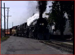Milwaukee 261 First Run. At Oshkosh, Wisconsin and on former Soo Line trackage. This track runs in the middle of the street, right through the city. Here is one exceptional scene. The 261 is chugging, loudly, on some street trackage! It has a GP30 and a rainbow of passenger cars. Sounds reverberate off the surrounding buildings.The wheels slip on a curve and the big engine regains a grip. Kind of demonstrates the power and majesty of a large steam engine. The producer, John Szwajkart also says this is a favorite scene of his. The big Northern type is spectacular to view, as it is chased across the countryside. In fact, the 261 film is memorable.