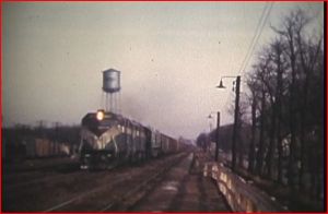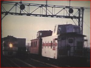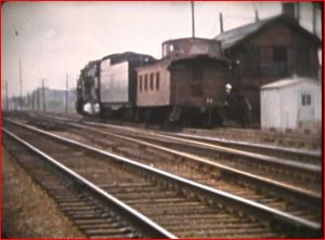 The old and new: two cabooses trail a GN F45 pair on the head of this passing freight. A CB&Q EMD is coming towards the camera. The wooden caboose appears in the 50’s and into the 60’s. The shiny steel cabooses were serving, well into the Burlington Northern era. Congress Park, and Brookfield have yielded many worthwhile scenes. This film collection is packed with ‘classic railroad’ scenes!