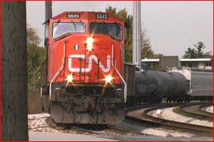 Stevens Point is another WC location. CN 2668 a C44-9W, heads a double stack. On the return trip, some pulpwood cars are in a train. Canadian National led trains show a much stronger presence.