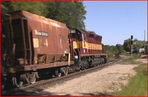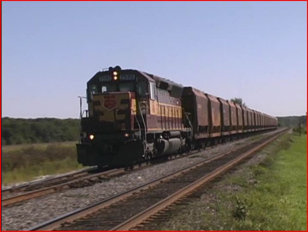 A WC pulls coal hoppers is viewed near Byron. Norfolk Southern 9556 a C40-9W, waits patiently in a siding for the highball. NS is also hauling coal cars. The action really picks up with more WC freights. The 9556 is chased for a bit.