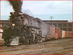 A Big Boy freight chugs past at yard limit speed. This is at Cheyenne.