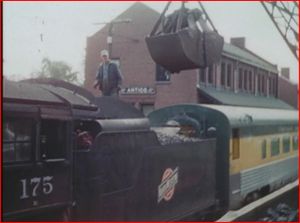 Another interesting view of the 175 on an excursion. At this late date, coal tipples weren’t easily found in a serviceable state. Bucket cranes did the honors.