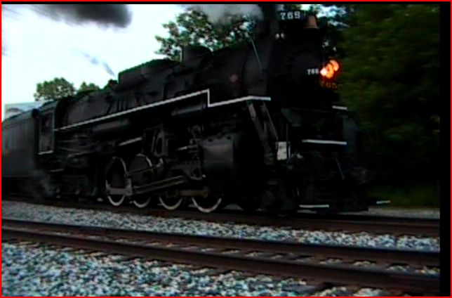 Nickel Plate 765 is one of the famous Berkshire 2-8-4. High Speed Service was the road’s slogan. The venerable engine will be speed restricted to 10 mph, for much of the move. Extreme heat caused the speed reduction on TP&W trackage. Loganport, Indiana.