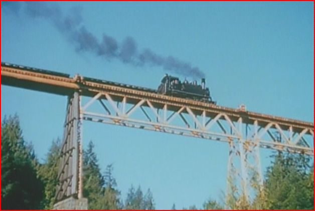 Rayonier 120 is a 2-6-6-2 articulated. Note the train crossing a wooden trestle. Logging!