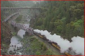 Railfair ’91 attracted Union Pacific 3985 and 844 doubleheaded to the fair. Much more action, with some spectacular scenery, as in Feather River Canyon.