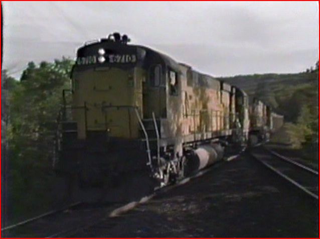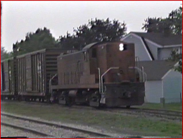 A look at E&LS reveal an old Baldwin diesel.The engine switches and pulls out, headed north.