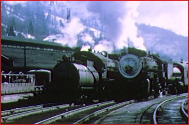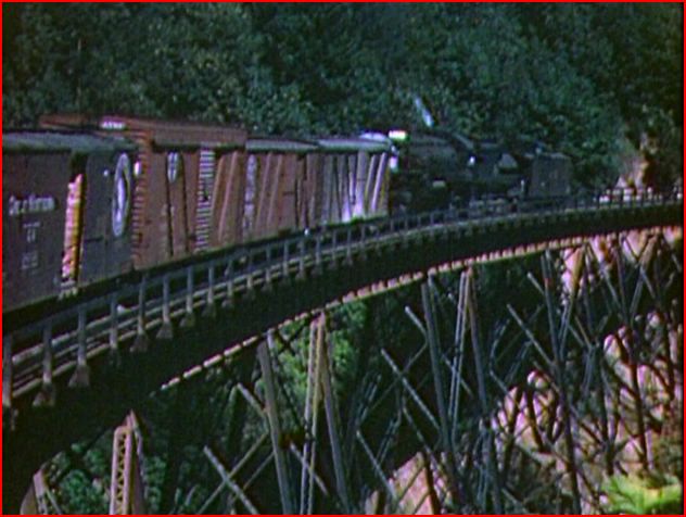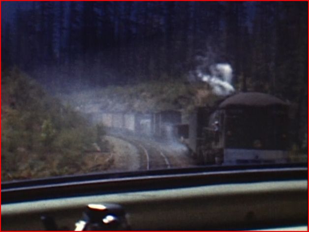 A 1949 cab ride aboard a daylight livery Alco PA is a highlight of this show. Cab Forwards are easily found. That’s brake smoke from the oncoming freight train. There is a wealth of cab ride action. Logging also is another highlight.