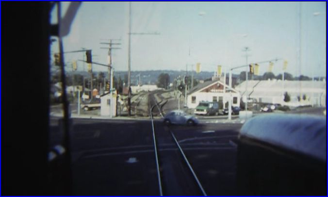 Street running at Renton. A Volkswagen Bug crosses ahead, as we see the Renton Station. This trackage and station, belong to Burlington Northern.