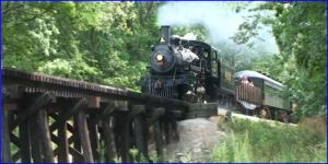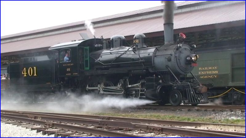 Southern Railway #401, a 2-8-0 at Monticello Museum. Push pull operation. The pretty 401 was returned to operation in 2010. Check the 1920’s era passenger cars. A Nickel Plate Road customized flatcar hauls a standing room only crowd! The Wabash caboose is a fine extra. Modern man elements appear in most scenes. Still, a pleasing engine.