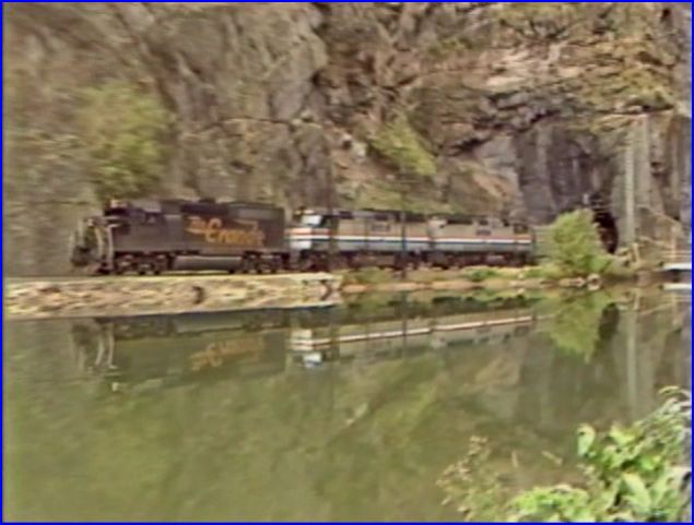 Sweet scene of California Zephyr traversing this riverfront canyon. Private varnish cars tail on some Amtrak moves, but no details are offered.