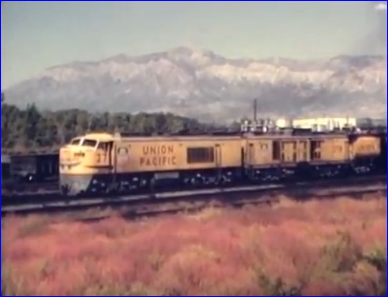 Union Pacific 13 is rated as an 8500hp unit. Leading 3 Southern Pacific SD45 engines, this train is chased and paced. Model railroaders would have a field day with the undulating trackside street and other elements visible on this sequence.