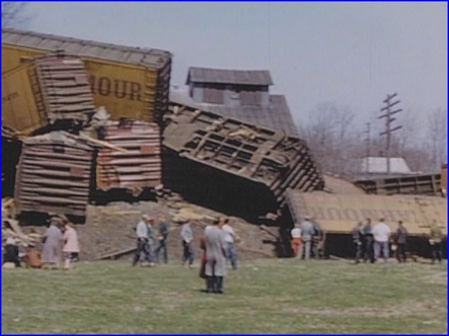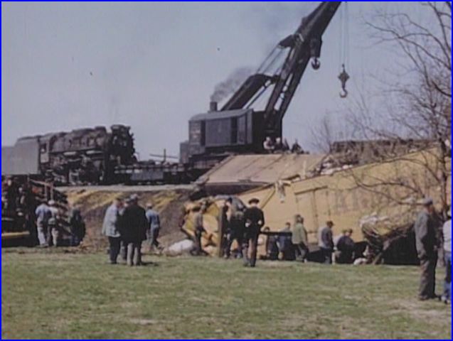 A massive pile of derailed cars. Berkshires and steam cranes are at each end of this disaster. Patient camerawork brings viewers into the scene.