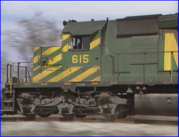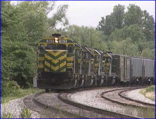 Obviously, the railroad is in it’s final stage. The green and yellow livery appears in two versions. Majority of the power has the locomotive numbers on the cab. Alternatively, numbers on the long hood. Weathering on those units, make it difficult to discern chevrons on the upper cab sections. Caboose fleet has a raunchy appearance.