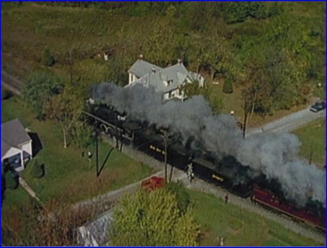 This aerial provides a model railroad type of scene. There is camera shake as we follow the train from the sky. Western Maryland trackage. Trestle crossings are a highlight.