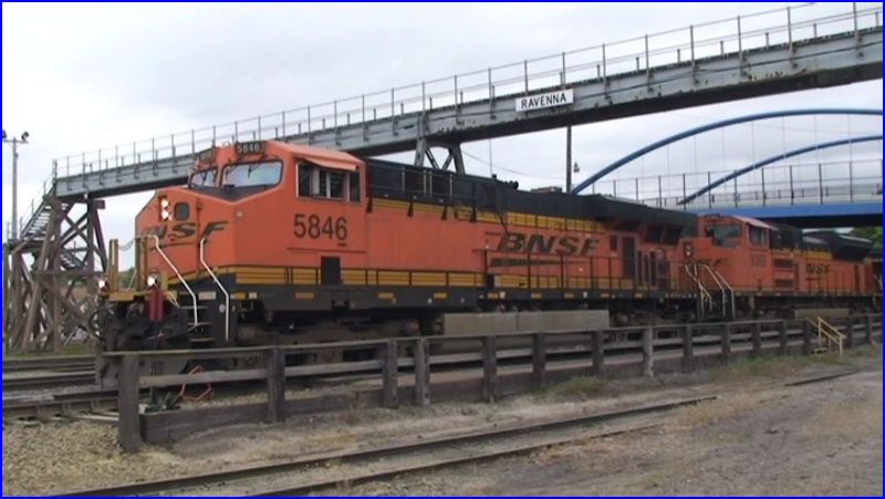 BNSF 5846 a GE ES44AC on the lead. Model railroaders will find Ravenna a location with good possibilities. The overhead walkway for example.