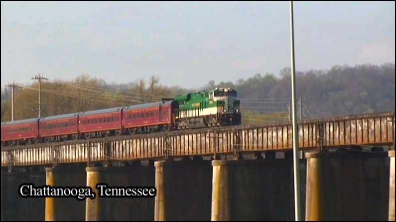 Southern 630 was sidelined for our first excursion. Southern diesel 8099 pinch hit for the steamer. In heritage paint, the modern engine looks resplendent in Southern green attire. Multiple outings behind 8099.