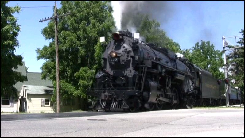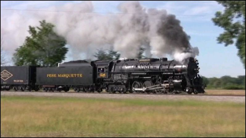 Pere Marquette 1225 is a Lima built Berkshire. Nice history of the design, with some historical film. In service at Train Expo in 2014. Overcast skies clear up on day two. Day three contains an alternate steam whistle. That whistle blows.