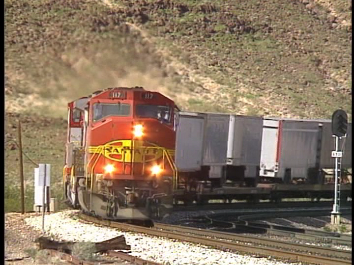 Santa Fe’s California desert crossing. The Mohave sub is 120 miles. Needles to Barstow. Mountain vistas, ghost towns, and the Mohave desert. Santa Fe trains speed across this division.