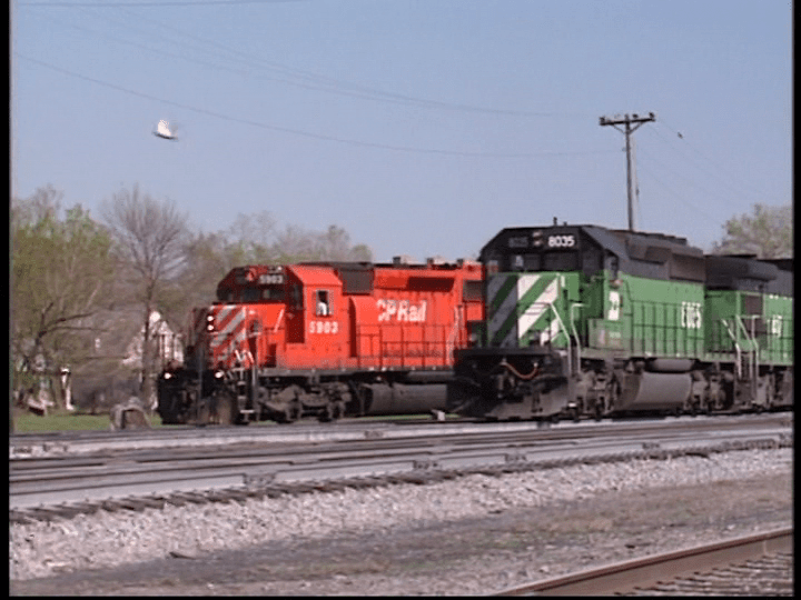 Burlington Northern on the BNSF mainline. The CP Rail train, is taking a turn onto Candian Pacific rails.