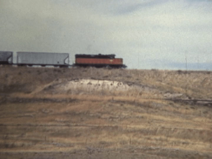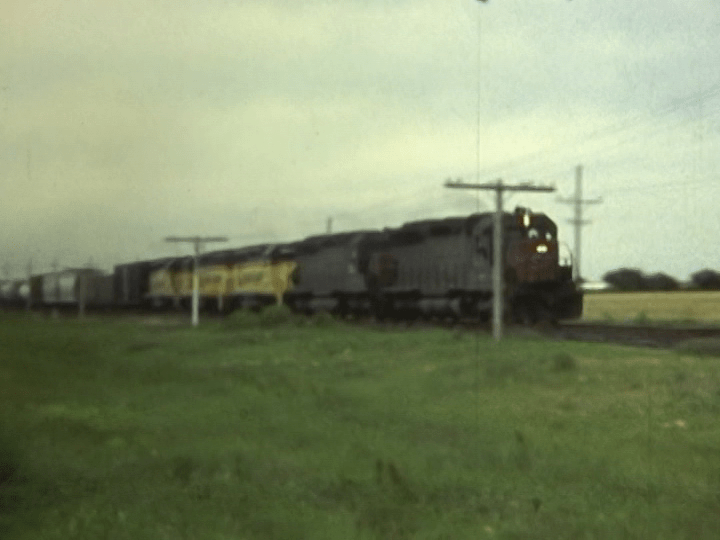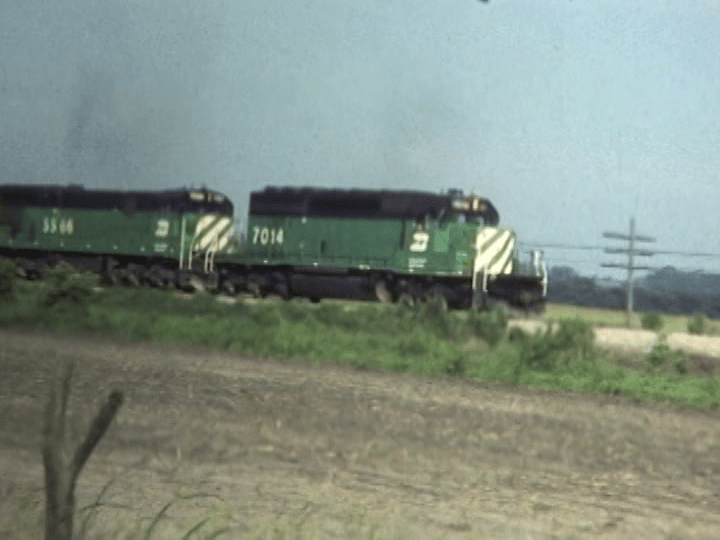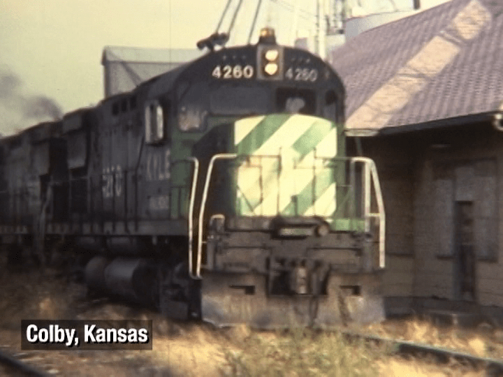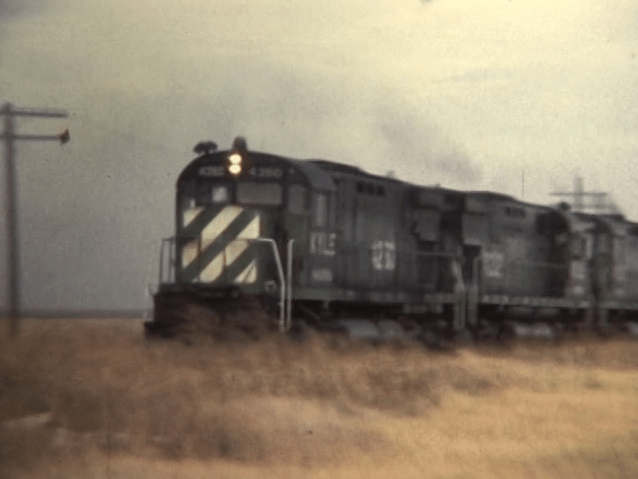 At US 24, A trio of Alco C425 Kyle units are met. These are still in Burlington Northern paint. The train is chased by Fred and his friend John Bjorkland, across Kansas. Hammer down boys!