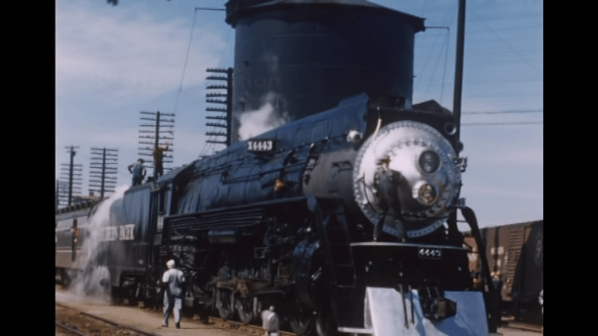 Northern class are shown, in the Oakland railyard. Off to Niles Canyon. 4443 with Daylight cars. Outstanding film quality on this 1957 fantrip. The Fresno Flyer. Train is followed.