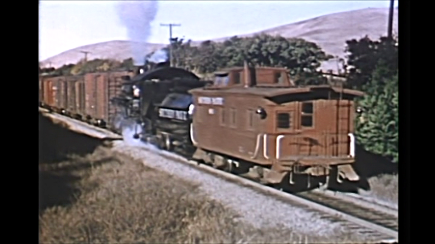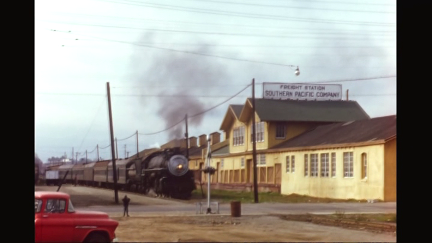 Northern class are shown, in the Oakland railyard. Off to Niles Canyon. 4443 with Daylight cars. Outstanding film quality on this 1957 fantrip. The Fresno Flyer. Train is followed.