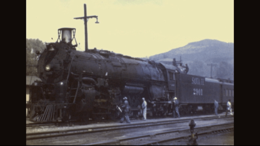 Santa Fe. Steam at Raton, New Mexico. #2901 is a 4-8-4, Northern type. Super Chief diesels. Other name trains introduced by ATSF.