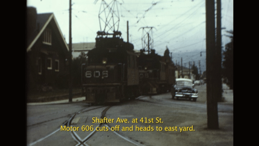 Oakland. Freight on the Electric line. Street running, as we follow along. Circa 1957. We continue to visit the area in the early 1950s. A combination of Riding and Viewing this operation.