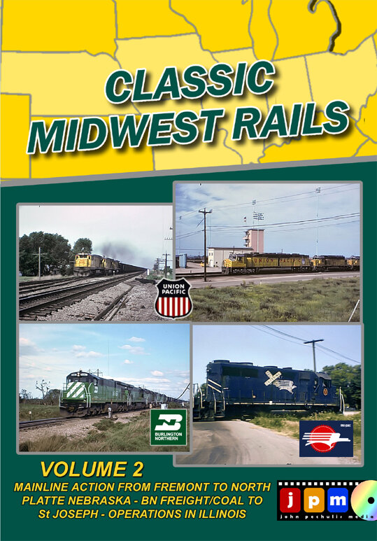 Volume 2 follows the Union Pacific westward. Fremont to North Platte, Nebraska. Return is, Burlington Northern from Grand Island to St. Joseph, Missouri. Finally, some action in Illinois.