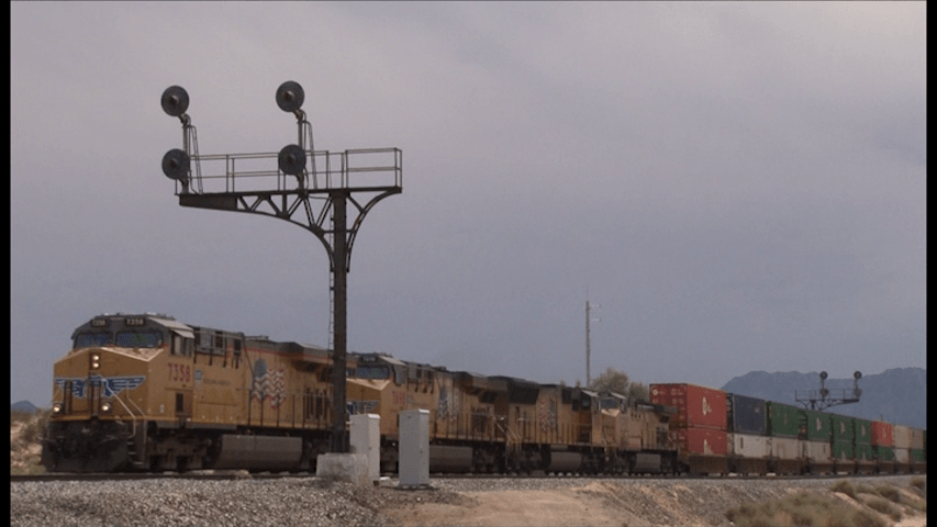 Approximately 300 miles covered on this Southern route. A little East of Yuma. To East of Tucson. Former SP tracks. Wellton has the Phoenix sub split off. Former SP signals. Heavy double stack traffic seen.