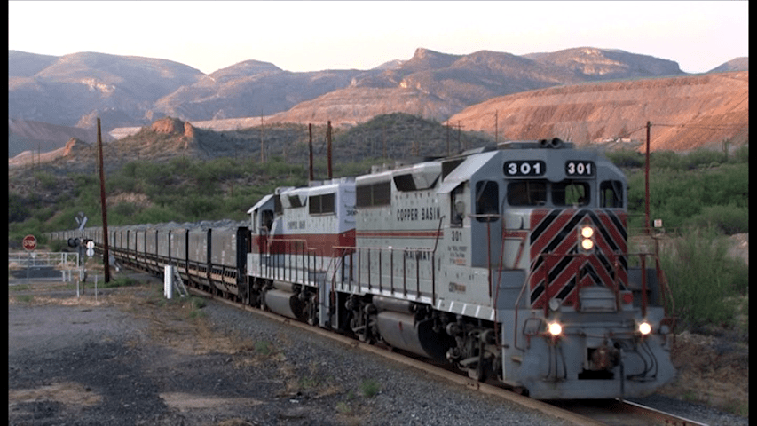 At Hayden, GP39 units. Ore trains. Serves the Ray Mine. This 54 mile line does haul some other freight, as well.