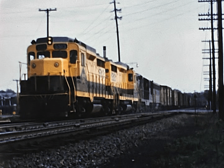 This program runs to the release of GP30 and GP35 diesels. A pair of GP30 units lead older first generation Electromotive power on a grade. This freight train is departing Allentown.