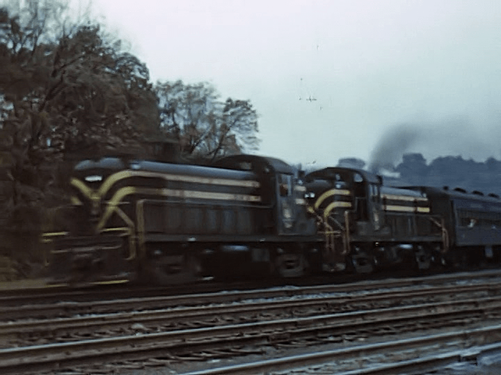 Jersey Central RS-3 pair couple to passenger cars, and pull out from the yard. Many used Reading power.