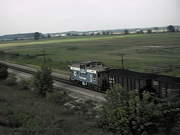 A Chessie System Safety caboose on a coal train. Circleville, Ohio. Show includes some assorted cabooses.