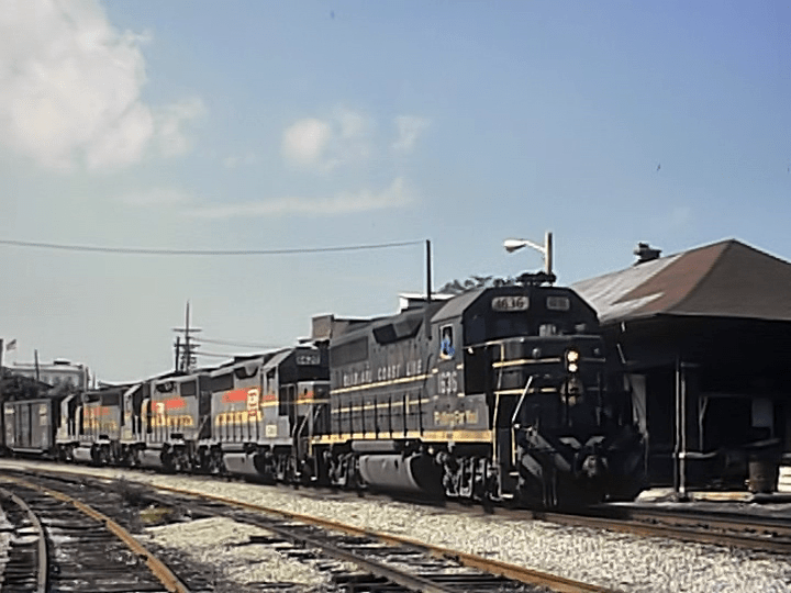 An early CSX train at Crawfordsville, Indiana. Seaboard Coast Line and Family Lines locomotives here.