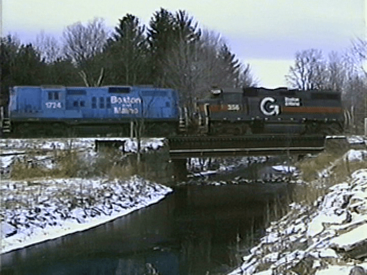 B&M GP39-2 356 leads B&M GP9 1724 across the water with a freight.