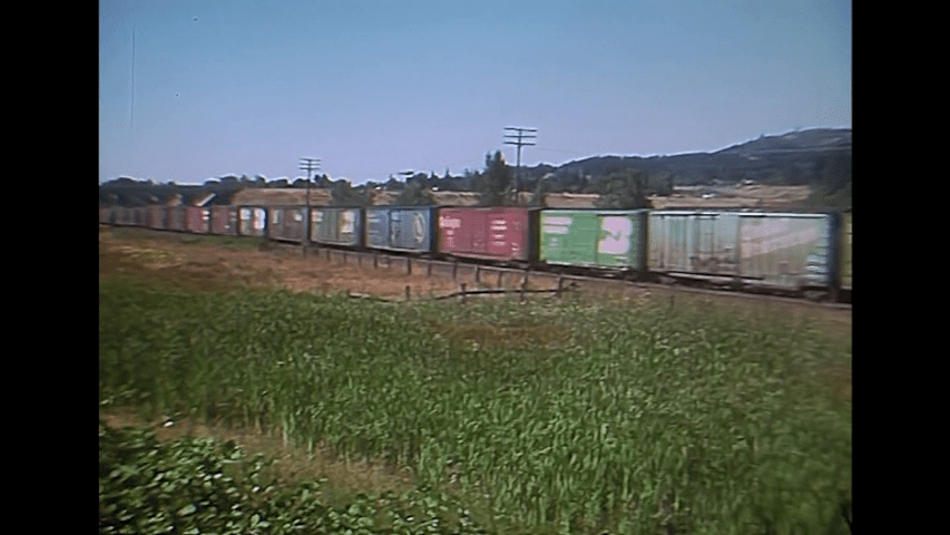 Burlington Northern, Burlington Route, and Great Northern boxcars on a Southern Pacific move by Clackamas, Oregon.