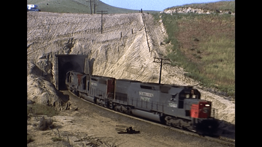 Southern Pacific with a long train at Tunnel 2. Many freight cars to see here.